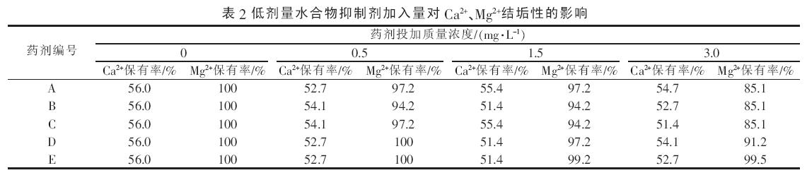 為驗(yàn)證低劑量水合物抑制劑對(duì)油田污水結(jié)垢性的影響,按表1 配制強(qiáng)結(jié)垢型的油田污水,并添加質(zhì)量分?jǐn)?shù)為0.5%~3%低劑量水合物抑制劑進(jìn)行試驗(yàn),結(jié)果見表2?試驗(yàn)表明,對(duì)于具有較強(qiáng)結(jié)垢趨勢(shì)的油田水質(zhì),加入水合物抑制劑后,Ca2+的保有率比空白稍有下降,但不顯著,即水合物抑制劑的加入對(duì)油田污水碳酸鈣垢的沉積不會(huì)造成太大的影響?除了E外, 隨著A~D 水合物抑制劑用量增加,Mg2+的保有率有不同程度的下降, 表現(xiàn)出對(duì)油田污水中Mg2+的沉積有一定的促進(jìn)作用?