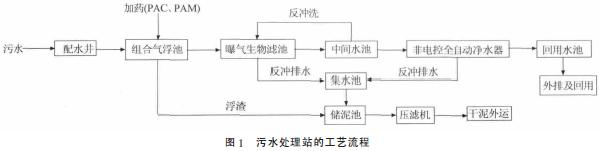 該造紙公司產(chǎn)生污水含有一定量的纖維素、半纖維素、短纖維、滑石粉等,總體來說污染程度較輕。因此選擇物化+生化+吸附工藝,使工程最終處理出水達(dá)到設(shè)計排放標(biāo)準(zhǔn)要求,工藝流程如圖1 所示。