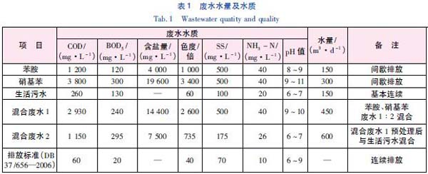 廢水來自還原和精制過程,主要分兩部分,其中苯胺進水pH 值為8~9,廢水量為150 m3 /d; 硝基苯進水pH 值為9~11,廢水量為300 m3 /d; 混合廢水量為450 m3 /d,COD 約為3 000 mg /L,含鹽量高,色度較高,氨氮含量高,是一種濃度高、成分復雜、難降解的有機化工廢水。