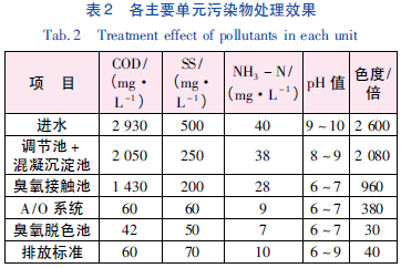 本工程經(jīng)過近2 個月的調(diào)試運行后,出水水質(zhì)穩(wěn)定,COD 總?cè)コ蕿?8.6%,達到設計要求。各單元的處理效果見表2。