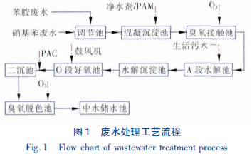 苯胺、硝基苯綜合廢水中含有大量難降解有機物,COD 值較高,可生化性極差(一般B /C 值為0 ~0.1) ,屬于高含鹽廢水,因此綜合考慮多種因素,決定采用物化與生化處理相結(jié)合的工藝。以混凝沉淀和臭氧氧化作為預處理單元,不會提高廢水的含鹽量,但可以提高廢水的可生化性,使A/O 生物系統(tǒng)處理效率大幅提高; 在末端再進行臭氧氧化脫色處理可確保出水色度達標。工藝流程見圖1。