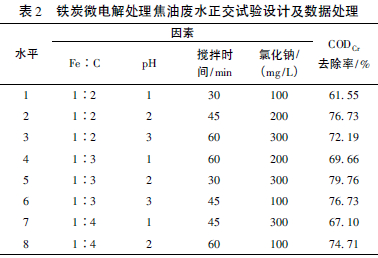 通過正交試驗(yàn),得到可以使CODCr去除率最高的最佳條件是: 鐵炭比為1∶3,pH值為2,氯化鈉投加量為200 mg/L,攪拌時(shí)間為45 min。在該條件下,焦油廢水的CODCr去除率最高,達(dá)到81. 26%。對于廢水的預(yù)處理來說,這樣的去除效果較為良好。
