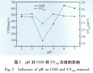 分別量取300 mL 廢水,并分別調(diào)節(jié)廢水pH =2、3、4、5、6、7,然后加入到500 mL 的光化學反應器中,再加入FeSO4·7H2O 顆粒,將光化學反應儀磁力攪拌調(diào)節(jié)到1 000 r /min,開啟磁力攪拌,使其充分溶解均勻,再加入28 mL 的雙氧水,同時通入臭氧,開啟光化學反應儀反應30 min,停止反應取樣測定處理后水樣的COD 和UV254,COD 和UV254的降解情況如圖3 所示。由圖3 可以看到,當pH=4,廢水的COD 和UV254都是降到最低,分別為357 mg /L 和1.67 cm-1。pH 一直影響是Fenton 反應的一個重要因素,傳統(tǒng)的Fenton 最佳pH 一般在3 左右。這在一定程度上影響了Fenton 法的工業(yè)應用,因為要將廢水的pH 調(diào)節(jié)到酸性條件下,增加了藥劑成本。由此可知道廢水降解最佳pH=4。