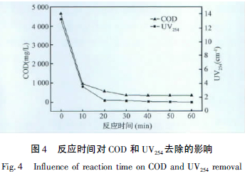 由圖4 可以看到,在反應起始的10 min 之內(nèi)COD 就降低到1 000 mg /L 以下,UV254變化趨勢也和COD 的變化趨勢一樣,快速降低,COD 和UV254在30 min 分別降低到352 mg /L、1.59 cm-1??赡苡捎趶U水中還含有Cu2+和Ni2+,這兩者與Fe2+發(fā)生協(xié)同催化作用,提高了催化降解速度。隨著反應時間的進行COD 和UV254變化不大,因此從設備的使用效率和處理速度來講,最佳反應時間可以定為30 min。