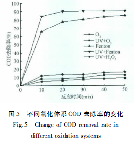 量取300 mL 廢水,調(diào)節(jié)其pH=4 分別采用O3、UV/O3、Fenton(28 mL H2O2、1.6g FeSO4·7H2O) 、UV-Fenton(28 mL H2O2、1.6g FeSO4·7H2O) UV/H2O2(2 mL H2O2) 氧化體系處理廢水50 min,并分別在0、10、20、30、40 和50 min 取樣,中止反應,測定處理后廢水的COD,其COD 去除率隨時間的變化如圖5 所示。