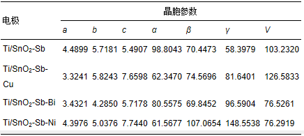 通過XRD分析軟件(X′Pert highscore plus)對數(shù)據(jù)進(jìn)行分析(晉勇等,2008)得到各電極的晶胞參數(shù)見表 1,分析表中數(shù)據(jù)發(fā)現(xiàn),對Ti/SnO2-Sb電極進(jìn)行金屬摻雜改性后,晶胞參數(shù)發(fā)生改變,主要體現(xiàn)在晶胞體積的增大或減小,這是由于各金屬離子成鍵半徑不同,當(dāng)金屬離子以固溶或者類質(zhì)同相的形式取代Sn4+進(jìn)入SnO2晶格內(nèi)部,必然引起金屬氧鍵的鍵長發(fā)生變化,從而造成晶胞參數(shù)的改變.XRD圖譜和晶胞參數(shù)等數(shù)據(jù)表明,通過金屬摻雜改性使金屬離子進(jìn)入到SnO2晶格中,其中,Cu和Ni以其p型半導(dǎo)體的性質(zhì)形成了空穴點位(劉淼等,2013),使電極表面形成較為密集的蜂窩狀,微觀結(jié)構(gòu)(圖 1)中也觀察到電極無裂縫且蜂窩狀結(jié)構(gòu)分布均勻,這樣的結(jié)構(gòu)可以增加電極的活性點位而提高電催化性能;而Bi則為n型半導(dǎo)體,與SnO2有著相似的性質(zhì),進(jìn)入SnO2晶格后主要通過增加自由電子的濃度來達(dá)到增強導(dǎo)電能力的效果.