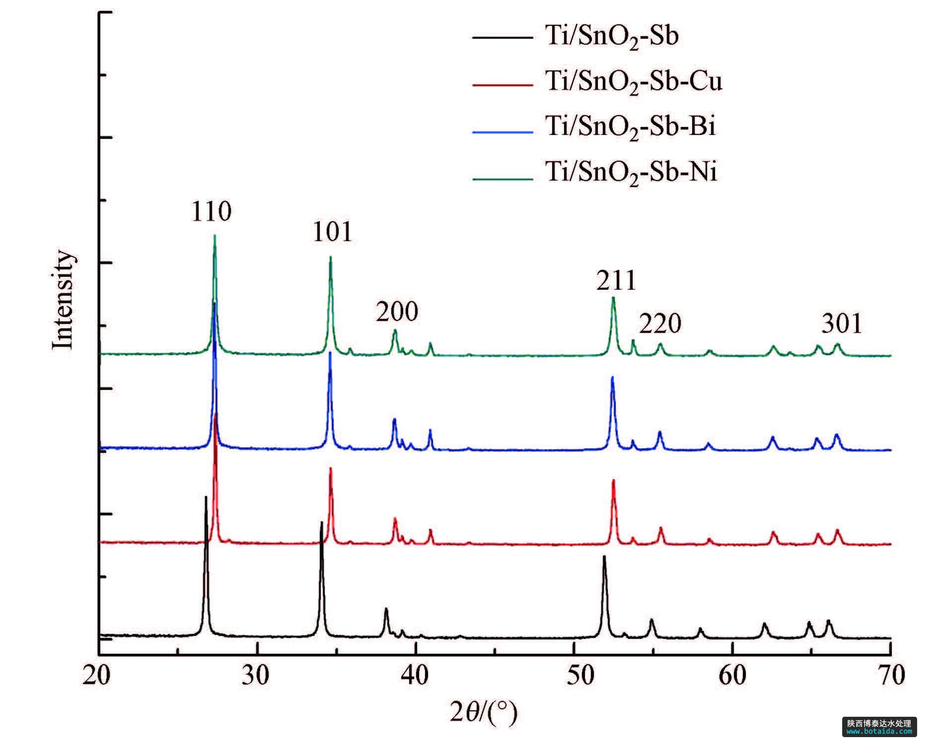 對所制備電極進(jìn)行XRD分析.從圖 2數(shù)據(jù)可見,所有電極的X衍射峰的位置跟四方形金紅石型的SnO2晶體結(jié)構(gòu)的標(biāo)準(zhǔn)卡片(00-041-1445)的峰數(shù)據(jù)基本一致,并未檢測到Sb及摻雜金屬相應(yīng)氧化物的衍射峰,表明金屬摻雜并沒有改變SnO2晶體結(jié)構(gòu).這可能是因為金屬離子進(jìn)入SnO2的晶格中取代了晶格中Sn4+的部分位置(李子榮和張雪梅,2006),以金屬氧化物的形式固溶到SnO2的晶格中,因而在XRD中Sb及摻雜的金屬沒有以單獨的氧化物形式存在.但是摻雜金屬后電極的X射線衍射峰位置發(fā)生了微小偏移,主要由于金屬離子與被替代的Sn4+之間離子半徑存在差異,以及金屬離子加入后出現(xiàn)的氧空穴而造成晶格缺陷.