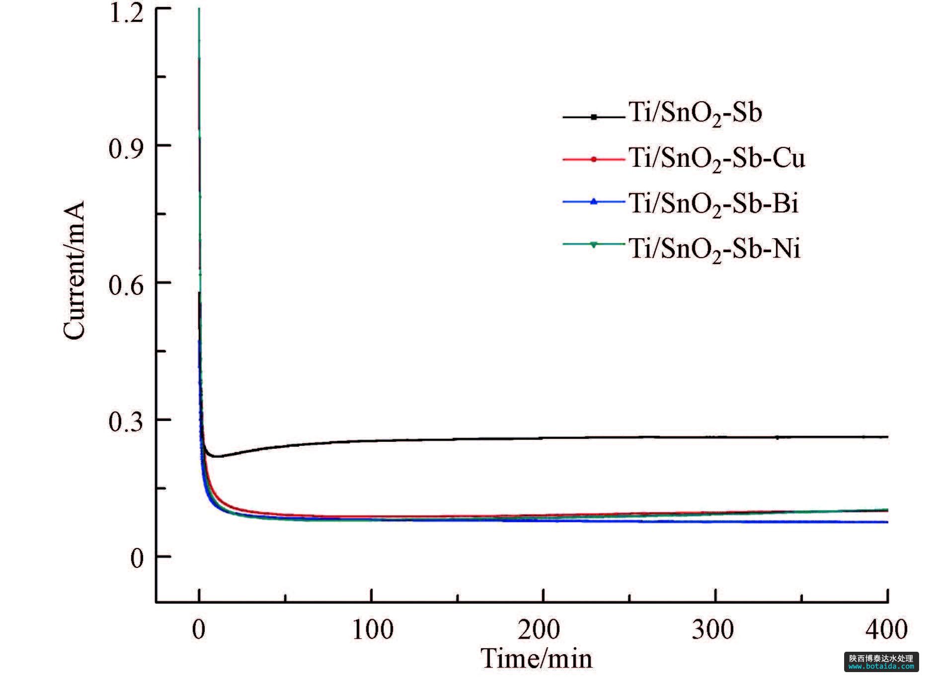 2)對各電極進(jìn)行電化學(xué)性能測試得出:各電極的析氧電位均在1.7 V(vs.SCE)以上,處于較高的析氧電位,具有較高催化活性和電流效率;循環(huán)伏安測試發(fā)現(xiàn)摻雜Cu的改性電極具有最優(yōu)的催化活性;電極的電流-時間曲線表明,4種電極的氧化電流基本恒定,金屬摻雜改性后電極氧化電流明顯低于未摻雜電極,說明改性電極具有較高的穩(wěn)定性.