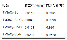 反應(yīng)速率常數(shù)越大說明有機物的降解速率越快,從表中可以看出在相同條件下,p-DCB在各電極上的反應(yīng)速率常數(shù)由大到小依次為KTi/SnO2-Sb-Cu,KTi/SnO2-Sb-Ni,KTi/SnO2-Sb-Bi,KTi/SnO2-Sb.因此p-DCB在Ti/SnO2-Sb-Cu電極上的降解速率最快,在Ti/SnO2-Sb電極上的降解速率最慢,可見金屬元素的摻雜對p-DCB的降解起到了促進(jìn)作用。