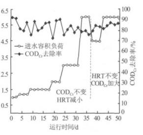 經(jīng)過近 40 d 的培養(yǎng)馴化,當(dāng)進(jìn)水 CODCr 為 1 100 mg/L,HRT 為 24 h 時 ,CODCr 去 除 率 穩(wěn) 定 在 92% 左右,進(jìn)入運(yùn)行特性試驗(yàn)階段,該過程分 2 個階段提高進(jìn)水容積負(fù)荷 。 CODCr 去除率隨進(jìn)水容積 負(fù)荷的變化情況見圖 2。