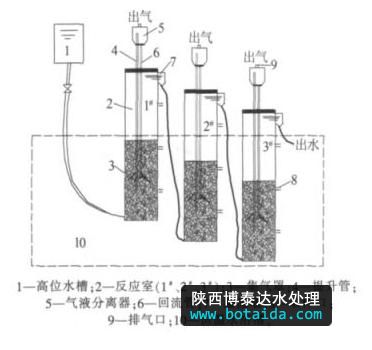 試驗(yàn)裝置如圖 1 所示 ,MICR 由 3 根 D 80 mm× 1 000 mm 的有機(jī)玻璃管串聯(lián)而成,總有效容積為 12.81 L,分為 1#、2#、3# 反應(yīng)室。各反應(yīng)室均設(shè) 3 個孔徑為 8 mm 的取樣口,取樣口分別位于距離 反應(yīng)室底部 100、350、700 mm 處,并用恒溫水浴槽控制試驗(yàn)溫度為(35±1 ) ℃。 廢水從高位槽向 1# 反應(yīng)室底部注入,然后由上部出水口經(jīng)溢流堰順管道進(jìn)入 2# 反應(yīng)室底部,依次推進(jìn),經(jīng)過 3# 反應(yīng)室之后排出 。各反應(yīng)室的氣體在集氣罩下方匯集,以泥水混合液的形式經(jīng)提升管進(jìn)入氣液分離器,氣體從排氣口排出,泥水混合液經(jīng)回流管回流至反應(yīng)室底部,形成液體內(nèi)部循環(huán) 。