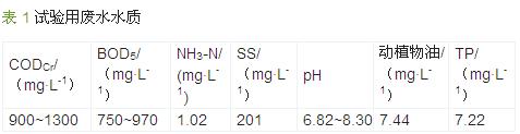 試驗(yàn)所用乳品廢水取自廣西皇氏甲天下乳業(yè)股份有限公司 ( 主要水質(zhì)參數(shù)見表 1 ),并根據(jù)需要添加了適量純牛奶,以提高 CODCr,以尿素為氮源 、磷酸二氫鉀為磷源,保持 m (CODCr) ∶ m (N) ∶ m (P) = 300 ∶5∶1 。為促進(jìn)污泥馴化,適量添加含有 Fe、Ca、 Mn、Zn、Co、K 等微量元素的營養(yǎng)液。