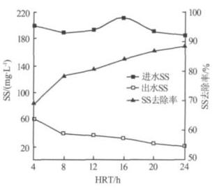 研究表明 HR T 對 SS 去除率有重要影響 〔5〕。 圖 4 為進(jìn)、 出水 SS 及 SS 去除率隨運(yùn)行時間的變化情況。