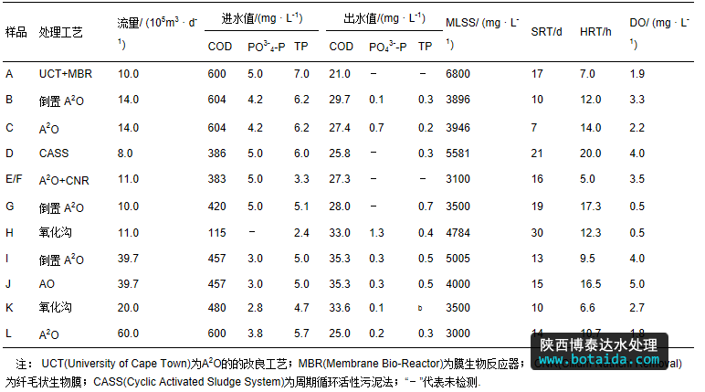 實驗所用的污泥樣品分別采集于9個污水處理廠,其中有2個水廠各包含2個工藝,共11個工藝.每個工藝取1個污泥樣品.其中,針對A2O+纖毛狀生物膜(CNR)工藝取2個樣品,分別位于加膜區(qū)和無膜區(qū),是為了考察加膜對聚磷菌的菌群結(jié)構(gòu)是否有影響,因此,共有12個樣品.12個樣品依次命名為A、B、C、D、E、F、G、H、I、J、K和L.其中,B和C取自同一水廠,I和J取自同一水廠,E和F取自A2O+纖毛狀生物膜工藝的加膜區(qū)和無膜區(qū).污水處理廠的運行參數(shù)及進(jìn)出水指標(biāo)見表 1.