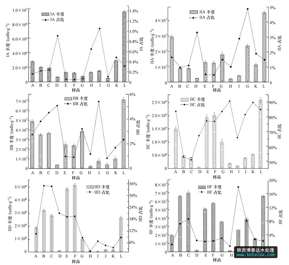 采用實時定量PCR定量分析Accumulibacter(I、IIA、IIB、IIC、IID、IIF)6個分支的豐度,結(jié)果如圖 1所示.Accumulibacter 6個分支均為單拷貝基因,即Accumulibacter的細(xì)胞數(shù)為ppk1基因的拷貝數(shù).總Accumulibacter的定量變化范圍為7.32×107(D)~3.05×109 cells · g-1(L),平均為1.20×109 cells · g-1(以MLSS計).在12個樣品中,只有D樣品數(shù)量級為107,比其他樣品低1~2個數(shù)量級,其中的Accumulibacter ppk1基因含量偏低;有6個樣品數(shù)量級為108,分別為H、B、C、I、J和K;樣品A、E、G、F和L的數(shù)量級為109,這5個樣品中的Accumulibacter的ppk1基因含量高于其他樣品,其中樣品L(A2O工藝)含量最高,達(dá)到了3.05×109 cells · g-1(以MLSS計).12個樣品中Accumulibacter占總菌的百分比變化范圍為0.58%~ 22.77%,平均為9.17%(圖 1).