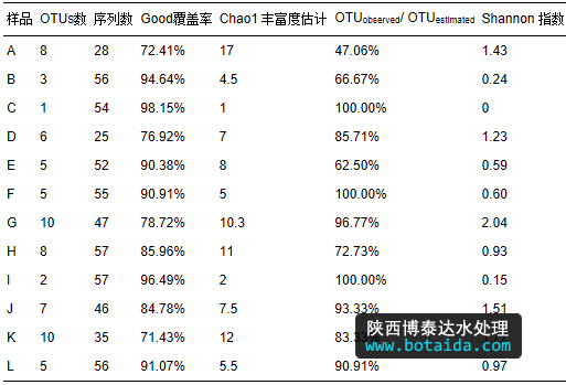 9個污水處理廠,共12個樣品,構(gòu)建12個ppk1基因克隆文庫進(jìn)行分析.12個克隆文庫的Good 覆蓋率、Chao1 豐富度估計、OTU 值與估計的 Chao1 值之比(OTUobserved/OTUestimated)、香農(nóng)指數(shù)見表 4.12個污泥樣品的ppk1基因的OTUs分布如圖 3所示.如表 4所示,12個樣品的Good覆蓋率變化范圍為71.43%~98.15%.計算的 OTU 值與估計的 Chao1 值之比除了樣品A為47.06%,其余11個樣品在62%~100%之間.Mehlig等(2013)對國外8個污水處理廠進(jìn)行了研究,Good覆蓋率只有35.4%~65.4%.說明本研究的12個克隆文庫可以代表 12個樣品中Accumulibacter的群落組成.樣品A可能需要測更多的數(shù)據(jù)保證數(shù)據(jù)的可信度.