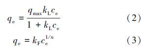 其中,qe為吸附平衡吸附量(mg · g-1),qmax為吸附劑飽和吸附量(mg · g-1),ce為平衡時溶液中剩余磷濃度(mg · L-1),kL為與熱力學有關的常數(shù)(L · mg-1),kF為與吸附強度有關的常數(shù)(L · g-1),n為與吸附能力有關的常數(shù).