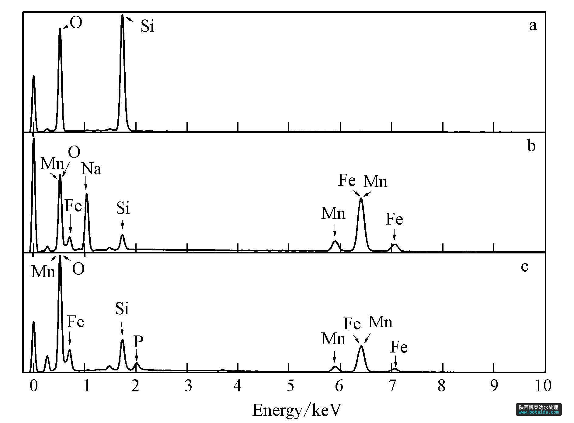 海砂與包覆海砂磷吸附前后的EDAX圖譜如圖 2所示. 海砂以硅元素與氧元素為主要成分,包覆鐵錳復合氧化物后,出現(xiàn)了明顯的鐵元素與錳元素的特征峰,表明鐵錳復合氧化物包覆在海砂的表面. 吸附磷后包覆海砂的EDAX圖譜又出現(xiàn)了磷元素的特征峰,表明鐵錳復合氧化物包覆海砂對溶液中的磷具有吸附性能.