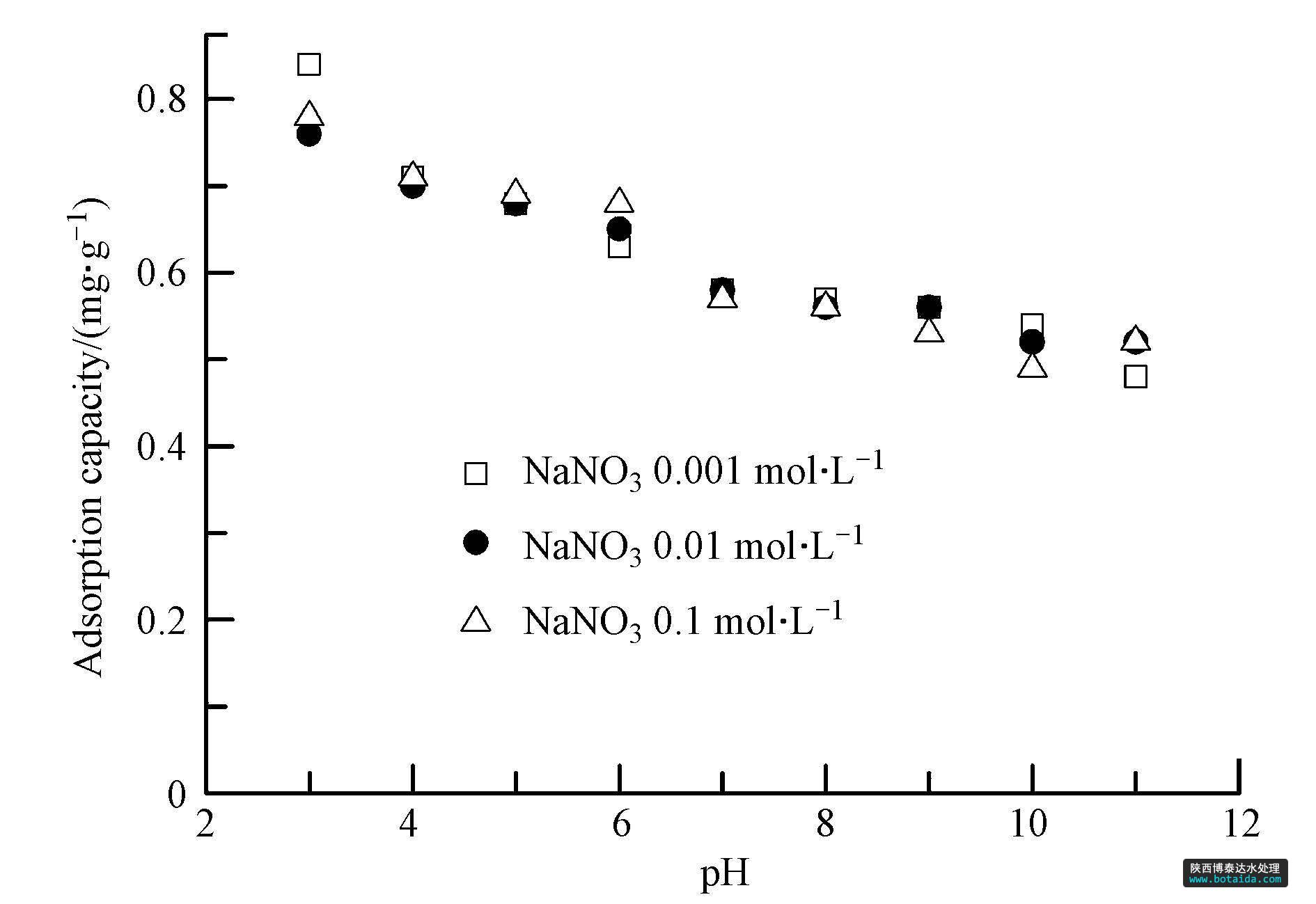 配制一系列50 mL濃度為5.0 mg · L-1磷溶液,分別投加200 mg吸附劑,考察不同pH(3.0~11.0)和不同離子強度(0.1 mol · L-1,0.01 mol · L-1,0.001 mol · L-1 NaNO3)對吸附磷的影響. 用HNO3和NaOH調(diào)節(jié)溶液pH,使pH穩(wěn)定在不同預定值.
