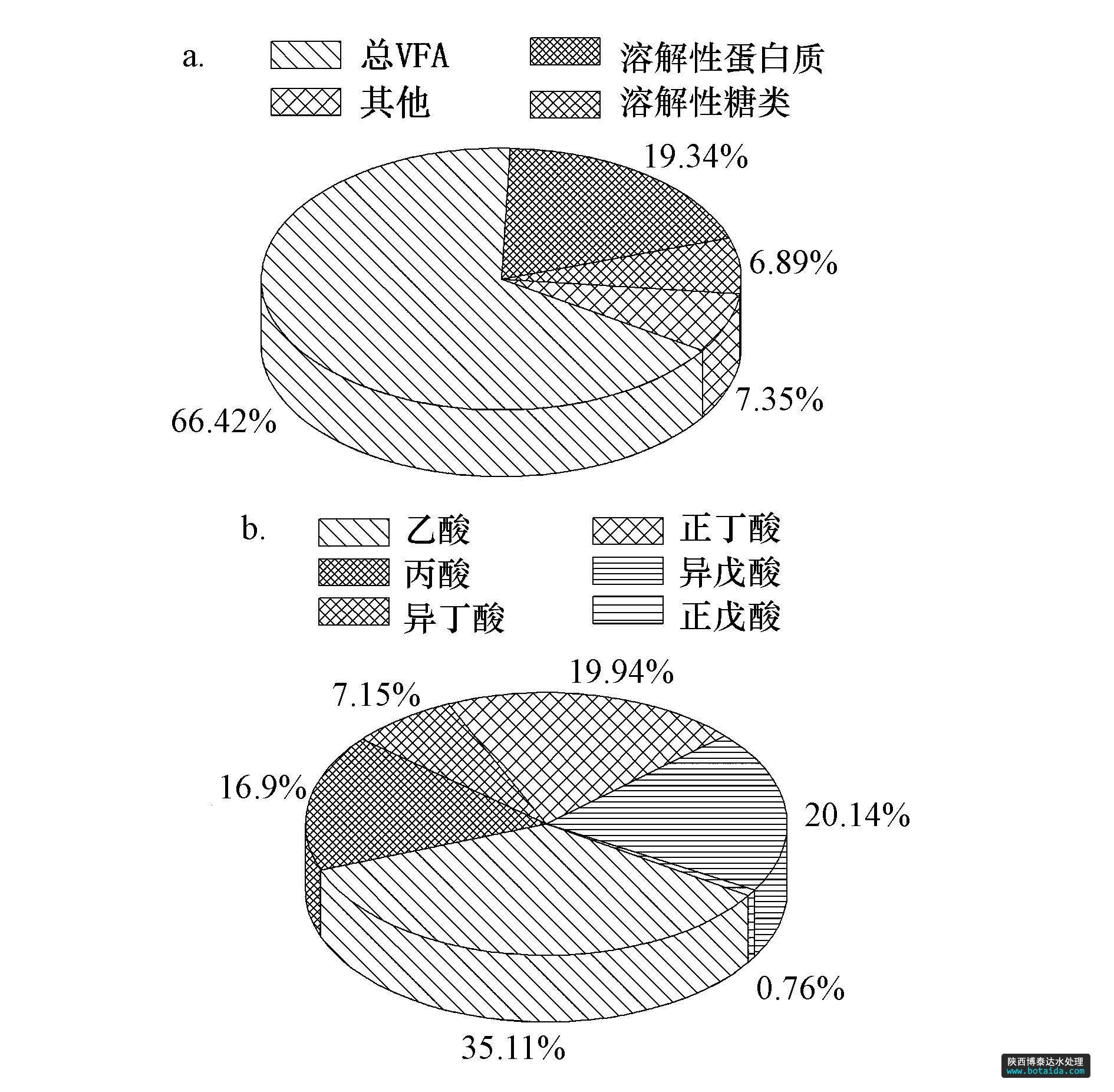 如圖 3所示,在碳源組成方面,優(yōu)化工藝條件下SCOD占TCOD的44.56%,總VFA占SCOD的66.42%,溶解性蛋白質(zhì)占SCOD的19.34%,溶解性糖類(lèi)占SCOD的6.89%,其他類(lèi)物質(zhì)占SCOD的7.35%.在VFA組成方面,乙酸占總VFA的35.11%,丙酸占總VFA的16.90%,異丁酸占總VFA的7.15%,正丁酸占總VFA的19.94%,異戊酸占總VFA的20.14%,正戊酸占總VFA的0.76%.碳源以總VFA為主,其中,VFA以乙酸、異戊酸、正丁酸、丙酸為主.