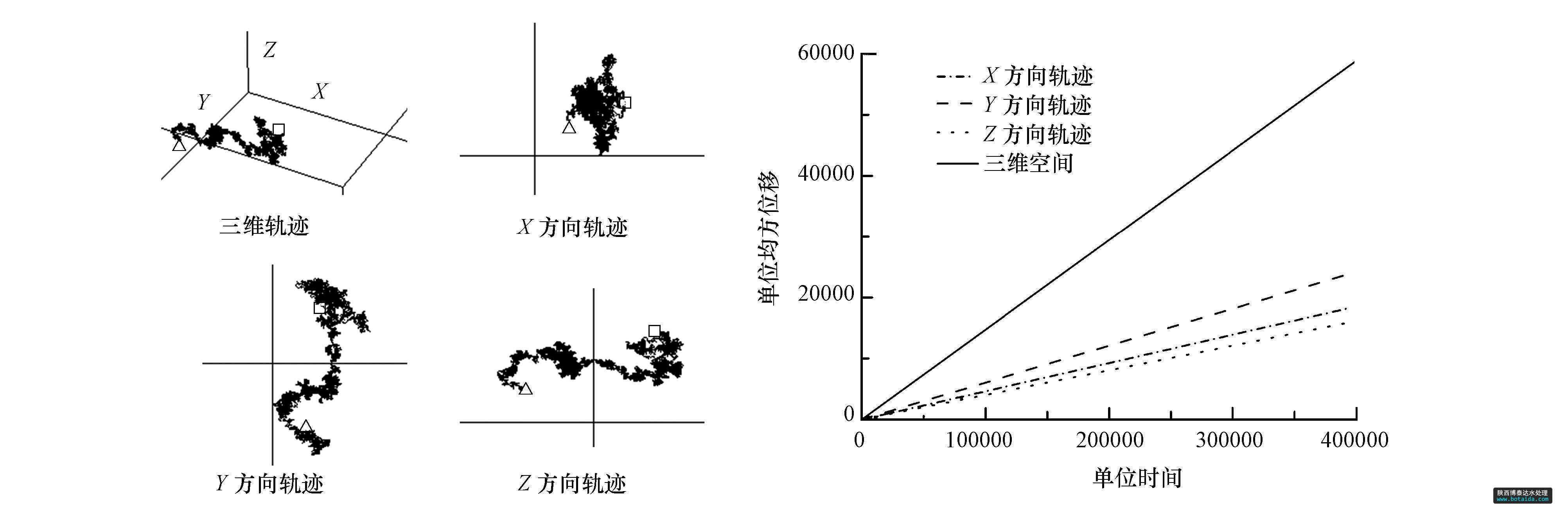 根據(jù)以上結(jié)果,利用Rwalk程序?qū)αW釉谧杂煽臻g與沉積物孔隙中的擴(kuò)散進(jìn)行隨機行走模擬,結(jié)果見圖 3(以W1點1~2 cm深度內(nèi)樣品為例),其中,空心方框和三角分別表示行走軌跡的起點和終點.由于沉積物結(jié)構(gòu)的各向異性,根據(jù)不同方向的均方位移與時間統(tǒng)計結(jié)果可以得到不同方向的曲率值.