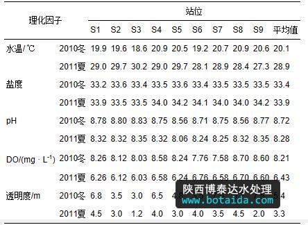 水溫、鹽度、電導(dǎo)率、溶解氧(DO)、pH值等理化因子通過(guò)采用美國(guó)YSI-561多參數(shù)水質(zhì)分析儀進(jìn)行現(xiàn)場(chǎng)測(cè)定,透明度用薩氏盤測(cè)定.