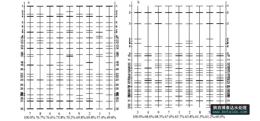 圖3 大亞灣海域浮游細(xì)菌16S rDNA V3區(qū)DGGE圖譜分析帶型圖(其中水平軸上的數(shù)字(1~9)為站點(diǎn)編號(hào),百分比是與標(biāo)準(zhǔn)泳道的匹配度; 垂直軸上的數(shù)字為DNA條帶編號(hào)(a. 2010年冬,b. 2011年夏))