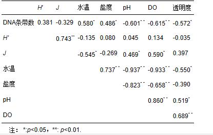 從浮游細(xì)菌與環(huán)境因子之間的相關(guān)關(guān)系可以看出,DNA指紋條帶數(shù)與環(huán)境因子密切相關(guān),其中與溫度和鹽度明顯正相關(guān)(p<0.05),而與pH、DO以及透明度明顯負(fù)相關(guān)(p<0.05或p<0.01),結(jié)果說(shuō)明高溫高鹽可促進(jìn)浮游細(xì)菌多樣性,而pH、DO、透明度下降等水質(zhì)惡化現(xiàn)象則可降低浮游細(xì)菌的種類豐富程度.H′值僅與J值呈明顯正相關(guān);而J則與水溫明顯負(fù)相關(guān),與pH和DO明顯正相關(guān).各種環(huán)境因子之間幾乎均呈現(xiàn)出明顯的相關(guān)關(guān)系,其中水溫與pH、DO、透明度均明顯負(fù)相關(guān)(p<0.05或p<0.01),說(shuō)明夏季水質(zhì)較冬季差;而DO又與pH和透明度明顯正相關(guān)(p<0.01).