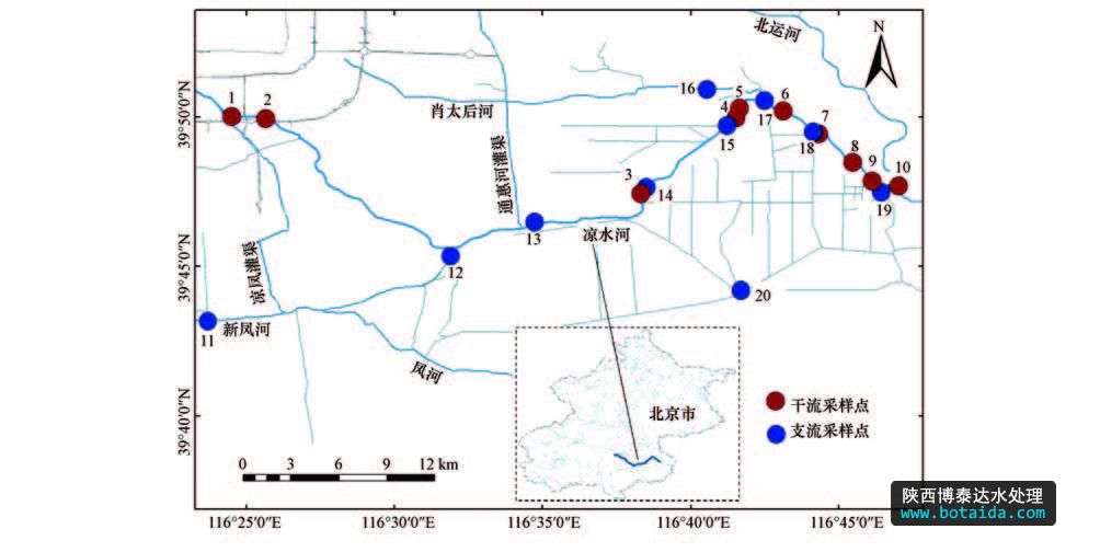 本文選取涼水河干流及其主要支流為研究對象.涼水河位于北京市南郊,隸屬北運(yùn)河水系,是北京市區(qū)的主要排水河道之一.涼水河全長53 km,流域面積約815 km2,屬于大陸性季風(fēng)氣候,夏季高溫多雨,冬季寒冷干燥,年均降雨量約為590 mm.涼水河是典型的非常規(guī)水源補(bǔ)給城市河流,主要以污水處理廠出水為補(bǔ)給水源(畢見霖等,2014).隨著城市經(jīng)濟(jì)的飛速發(fā)展,生產(chǎn)、生活污水不斷排入水體,污水中的重金屬大部分通過各種物理化學(xué)作用迅速轉(zhuǎn)移到沉積物中(陳春霄等,2011),由于重金屬難以降解,其在沉積物中富集對人體和環(huán)境造成了嚴(yán)重的威脅.