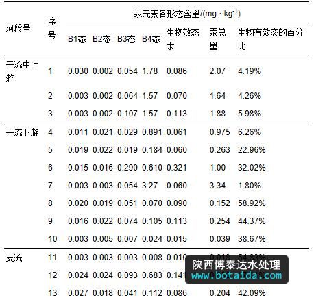 由圖 2可知,涼水河表層沉積物中各形態(tài)汞含量存在差異,在涼水河干流上游、干流下游及支流表層沉積物中均以B4態(tài)為主要賦存形態(tài),其中B4態(tài)所占比例均值分別為94.81%、69.41%和74.89%,平均百分比為75.96%;B3態(tài)所占比例均值分別為4.40%、18.40%和13.20%,平均百分比為13.70%.總體來看,在涼水河干流上游、干流下游及支流表層沉積物中,汞各形態(tài)所占比例大小順序均為B4>B3>B2>B1.涼水河表層沉積物中汞主要以B4態(tài)存在,表明涼水河表層沉積物中汞的生物可利用性低.