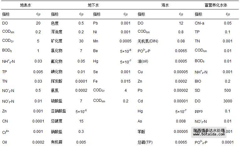 式(2)~(7)中,cj為指標j的實測值或標準值;cj0為設定的指標j的參照值,4類水體95項指標的參照值cj0和室內、外空氣29項指標的參照值cj0分別如表 1和表 2所示.