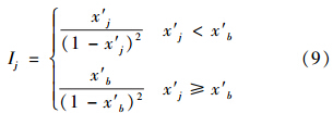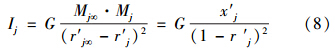 式中,Mj和Mj∞分別為指標j的樣本“規(guī)范質量”和“參照級”樣本“規(guī)范質量”;r′j為指標j的樣本的“規(guī)范坐標”,顯然r′j=x′j;G為環(huán)境質量引力常數(shù),其取值大小只是為了控制指數(shù)Ij的尺度范圍,對評價結果無任何影響,為簡單起見,在此取G=1.從而式(8)可表示為: