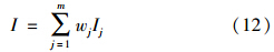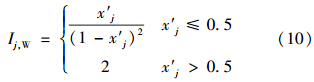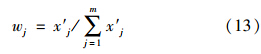 式中,Ij為由式(10)或式(11)計算得到的指標j的引力指數(shù)值;wj為指標j的歸一化權值,即滿足∑ m j=1 wj=1,它可以視實際問題需要,采用某種方法確定.一般情況下,只要各指標的規(guī)范值x′j差異不大,可視各指標為等權即可;但若最大指標規(guī)范值x′j,max與最小指標規(guī)范值x′j,min差異較大,則可采用如式(13)所示的對各指標規(guī)范值x′j的線性加權計算權值.