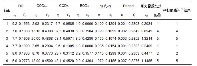 2008年圖們江干流6個斷面的6項地表水水質指標監(jiān)測數(shù)據(jù)cj(唐立新等,2010),以及由式(1)和式(2)計算得到的指標規(guī)范值x′j如表 5所示.對斷面2和3,采用式(13)對引力指數(shù)值進行加權計算;其余斷面在視指標為等權的情況下,用式(10)和式(12)計算得到各監(jiān)測點水質引力綜合指數(shù)值,并根據(jù)表 3中3類陸地水體的引力綜合指數(shù)值的分級標準做出水質類別判斷結果(表 5).表 5中還列出了參考文獻(唐立新等,2010)中用密切值法作出的評價結果.可以看出,利用引力普適指數(shù)公式和用密切值法對6個斷面水質做出的評價結果,完全一致.
