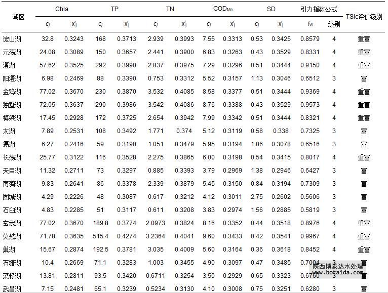表 9 長江中下游45個湖泊富營養(yǎng)化指標監(jiān)測數(shù)據(jù)cj及其規(guī)范值 x′j和引力指數(shù)公式評價結果