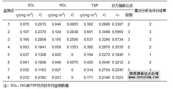 武漢市不同測點的空氣指標日平均濃度監(jiān)測數(shù)據(jù)cj(郭紹英等,2009),以及由式(1)和式(6)計算出的指標規(guī)范值x′j如表 10所示.在視各指標為等權的情況下,將表 10中的3項指標規(guī)范值x′j分別代入式(11)和式(12)所示的引力指數(shù)公式,計算得到武漢市各測點空氣質量引力綜合指數(shù)值,并根據(jù)表 3中空氣環(huán)境質量綜合指數(shù)值分級標準作出的判斷結果(表 10).表中還列出了參考文獻(郭紹英等,2009)中用集對分析法作出的評價結果.可以看出,引力指數(shù)公式評價結果與集對分析評價結果完全一致.