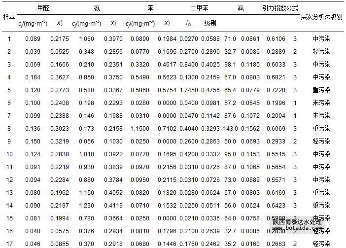2002年11—12月長春市30個室內樣本5項指標監(jiān)測數(shù)據(jù)cj(湯紅巖等,2005),以及由式(1)和式(7)計算出的指標規(guī)范值x′j如表 11所示.由于樣本1、11~15、26和27的不同指標計算得到的規(guī)范值相差較大,因此,在用式(12)計算引力綜合指數(shù)時,需用式(13)對引力指數(shù)值進行加權計算,其余22個樣本的指標視作等權,計算得到各樣本引力綜合指數(shù)值,并根據(jù)表 3中空氣環(huán)境質量引力指數(shù)分級標準做出評價結果(表 11).表中還列出文獻(湯紅巖等,2005)中用層次分析評價法做出的評價結果.由于文獻(湯紅巖等,2005)中的層次分析評價法將室內空氣污染劃分為清潔(1*級)、未污染(2*級)、輕污染(3*級)、中污染(4*級)和重污染(5*級)等5級;而本文引力指數(shù)法將其劃分為1級、2級、3級.二者對應關系為:(1*級清潔、2*級未污染)對應1級,(3*級輕污染)對應2級,(4*級中污染、5*級重污染)對應3級.由表 11可以看出,二種方法評價結果完全一致.