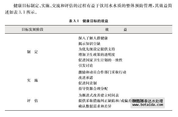基于健康的目標(biāo)適用于各種發(fā)展水平的國家。為了確保有效保護(hù)和改善健康,設(shè)定的 目標(biāo)必須是現(xiàn)實(shí)的、可衡量的、基于科學(xué)的數(shù)據(jù)并與當(dāng)?shù)貤l件(包括經(jīng)濟(jì)、環(huán)境、社會和文化 條件)以及財(cái)政、技術(shù)和體制資源相適應(yīng)。健康目標(biāo)應(yīng)是整體公共衛(wèi)生政策的一部分,應(yīng)將 公眾衛(wèi)生現(xiàn)狀和趨勢、飲用水對于傳染性疾病傳播和有害化學(xué)品在個(gè)體水平和整個(gè)衛(wèi)生管 理中的作用考慮在內(nèi)。