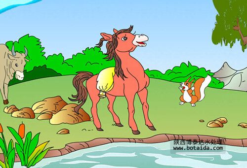 他剛一邁腿,忽然聽見一個聲音說:“小馬,小馬別下去,這河可深 啦。”小馬低頭一看,原來是小松鼠。小松鼠翹著她的漂亮的尾巴,睜者圓圓的眼睛,很認(rèn)真地說:“前兩天我的一個伙伴不小心掉進(jìn)了河里,河水就把他卷走了。”小馬一聽沒主意了。