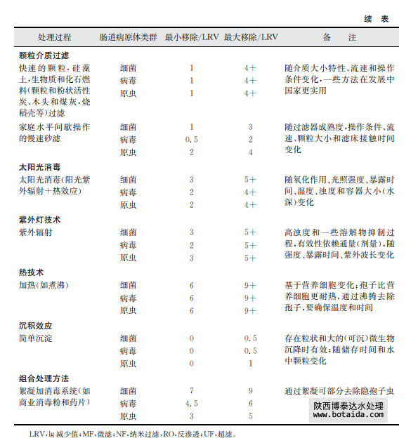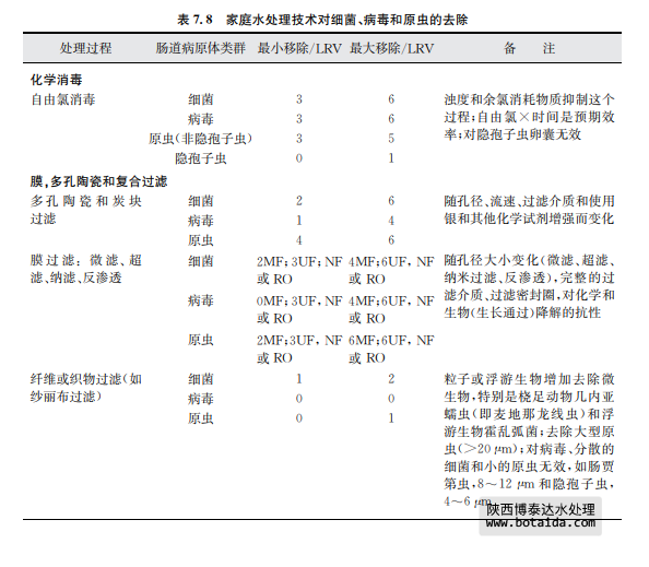 表7.8總結(jié)了采用上述幾種家庭水處理技術(shù)對水傳播細(xì)菌、病毒和寄生性原生蟲的 去除情況。這些去除信息是基于科學(xué)文獻(xiàn)報(bào)告的研究結(jié)果。有兩個有效性內(nèi)容:基本去 除和最大去除?;救コ侵赣上鄬Σ皇炀毴藛T實(shí)際操作時的一般運(yùn)行效果,且操作人 員將以上方法用于處理平均水質(zhì)或可變水質(zhì)原水及現(xiàn)場只有很少應(yīng)用工具以優(yōu)化處理?xiàng)l 件和操作時。最大去除是指在熟練操作和優(yōu)化運(yùn)行條件下,并且在可預(yù)見和不變水質(zhì)條 件下,有相關(guān)儀器工具支持并保持最高水平運(yùn)行時達(dá)到的效果(如測試一個已知濃度和種 屬的微生物時)。應(yīng)當(dāng)該注意的是某些水處理工藝的lg減少值存在差異,如表7.8中的 家庭水處理和表7.7中的集中處理。這種相同處理技術(shù)、不同的運(yùn)行效果差異是可以理 解的。因?yàn)榧刑幚硭盟ǔM足處理工藝所需要的質(zhì)量,而且處理過程由訓(xùn)練有素的操作人員使用,工藝經(jīng)過合理的設(shè)計(jì)并有良好的運(yùn)行控制系統(tǒng)。相反,家庭水處理通常 水質(zhì)變化較大,也沒有得到最好的運(yùn)行技術(shù)優(yōu)化。相對于管理集中處理設(shè)施的人員,處理 過程也常常得不到專業(yè)人員的專業(yè)運(yùn)行控制。這些處理過程的進(jìn)一步細(xì)節(jié),包括運(yùn)行影 響因子和表7.8中提供的lg減少值水平基礎(chǔ),可見附錄1支持性文件《家庭水管理和家庭 水處理選擇評估》。陜西博泰達(dá)水處理為您提供服務(wù)。