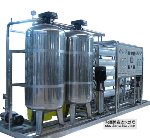 原水→原水加壓泵→多介質(zhì)過(guò)濾器→活性炭過(guò)濾器→軟水器→精密過(guò)濾器→第一級(jí)反滲透 →PH調(diào)節(jié)→中間水箱→第二級(jí)反滲透(反滲透膜表面帶正電荷)→純化水箱→純水泵→微孔過(guò)濾器→用水點(diǎn)