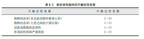 涉及一般人群的接觸劑量時,以動物實驗臨界效應(yīng)得出的犖犗犃犈犔或犅犕犇/犅犕犇犔通 常要除以不確定性系數(shù)100。這里還有兩個10倍系數(shù),其一是物種間差異,另一個是人群中 個體間差異(見表8.2)。另外的不確定性系數(shù)還可能來自數(shù)據(jù)資料的不足和有害作用的嚴 重性和不可逆性。