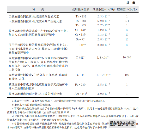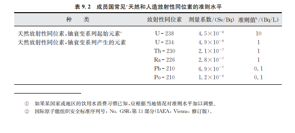 從放射學(xué)的角度,超過準則值的程度也是一個需要考慮的關(guān)鍵問題。防護電離輻射和輻 射源安全的國際基本安全標準在有關(guān)現(xiàn)有暴露的章節(jié)提到了飲用水并提出由使用飲用水帶來 的個人年最高輻射劑量最大不能超過約1mSv②。這一水平不應(yīng)被當(dāng)作“可接受的”水平或限 制性水平,并應(yīng)盡可能地采取有效措施減少受到的輻射水平。每種超過準則水平的情況不同, 在做出最后的決定之前還需要考慮一些非放射方面的因素(如補救措施的經(jīng)濟成本、其他供水 源的實用性)。政府的有關(guān)部門應(yīng)意識到,放射性同位素(如鈾)同時具有化學(xué)毒性,那么在水 中的允許濃度可能需要以其同位素的毒性確定,而不是依據(jù)放射性(見第12章)。
