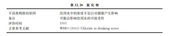 飲用水中的氯化物(見表12.26)主要有天然來(lái)源、污水排放和工業(yè)污染物、含有防凍鹽 的城市地表徑流和咸水侵蝕。 人對(duì)氯化物的主要暴露來(lái)自添加至食物中的鹽,并且從食物中攝入的氯化物遠(yuǎn)比從飲 水中取得多。