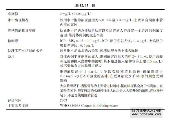 銅既是基本營養(yǎng)元素,又是飲用水的污染物(見表12.35)。銅可用于制造管件、閥門和 配件,還可用于合成合金和鍍層。五水硫酸銅化合物有時會用于地表水中的藻類控制。飲 用水中銅的濃度范圍很廣。大多數(shù)情況,其主要來自銅制水管內(nèi)部的腐蝕。不過不斷流動 的水或有壓流的水中銅的濃度往往較低。反之,在靜止的水或部分流動水中銅的濃度變化 很大,最高濃度較高(經(jīng)常高于1mg/L)。在水輸送過程中,特別是輸水系統(tǒng)中處理過的水 呈酸性或含高濃度碳酸鹽而呈堿性的水中,往往會使銅的溶解增加,濃度升高。發(fā)達(dá)國家中, 食物和水是銅的主要暴露源。在使用裝有銅水管或接頭的管網(wǎng)系統(tǒng)中,水流經(jīng)常靜止或部分 流動條件下,可以大大增加每日銅的攝入量,特別是嬰兒人工喂奶時用自來水調(diào)配的奶。