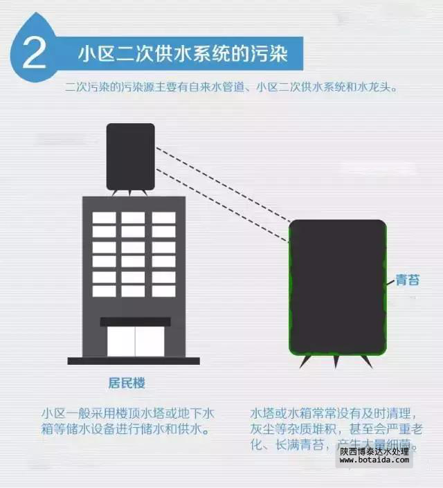小區(qū)一般采用樓頂水塔或地下水箱等儲水設(shè)備進行儲水和供水。而水塔或水箱常常沒有及時清理,灰塵等雜質(zhì)堆積。有的儲水設(shè)備甚至?xí)?yán)重老化、長滿青苔,產(chǎn)生大量細(xì)菌滋生。