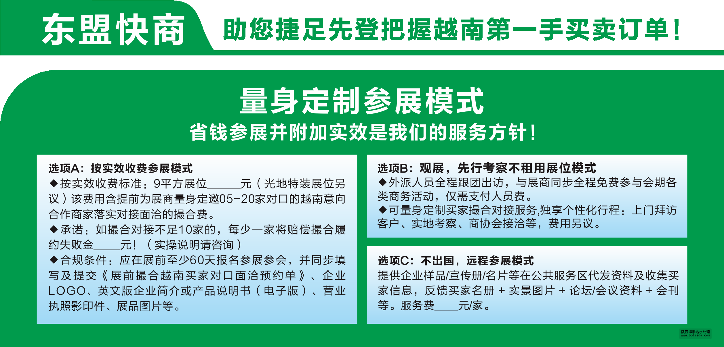 合規(guī)條件:應(yīng)在展前至少60天報(bào)名參展參會(huì),并同步填寫及提交《展前撮合越南買家對(duì)口面洽預(yù)