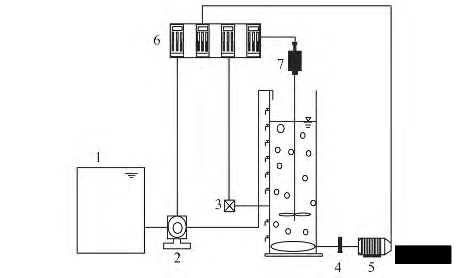 1. 進水箱; 2. 蠕動泵; 3. 出水; 4. 氣體流量計; 5. 鼓風(fēng)機 6. 進水、出水、攪拌、曝氣時序控制器; 7. 攪拌機