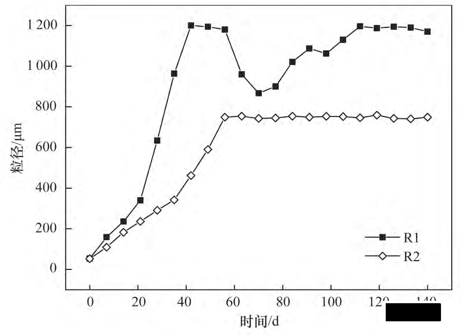 R1、R2 分別以人工配水和實際生活污水為進水,接種污水處理廠普通絮狀活性污泥,采取逐漸縮短沉淀時間的方式培養(yǎng)好氧顆粒污泥. R1、R2分別在第 20 d、35 d 時,出現(xiàn)細小顆粒,如圖 2 所示,分別歷時 25 d、42 d 后,顆粒污泥的平均粒徑達到 340 μm,好氧顆粒污泥工藝啟動成功. 顆粒污泥穩(wěn)定后,其平均粒徑分別達到1 200 μm、750μm. 有研究表明進水有機負(fù)荷是好氧顆粒污泥形成的重要影響因素,有機負(fù)荷較低,微生物生長速率減慢,不利于顆?;? 人工配水中的有機物易被微生物吸收利用,而實際生活污水水質(zhì)成分復(fù)雜,由易生物降解物質(zhì)、慢速生物降解物質(zhì)和溶解性惰性物質(zhì)組成,其中,溶解性惰性物質(zhì)包含不可生物降解的 COD 組分,生活污水中能被微生物利用的有機負(fù)荷較人工配水少,故 R2 相對R1 污