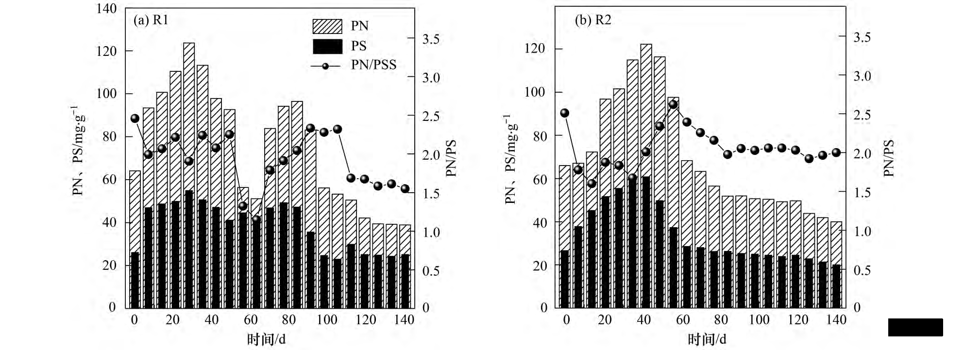 胞外聚合物( EPS) 主要由蛋白質(zhì)( PN) 和多糖 ( PS) 組成,在污泥顆粒化過程中具有重要作 用. 如圖4 所示,PN、PS 在顆粒污泥啟動階段 ( 0 ~ 25 d 和 0 ~ 42 d) 整體呈上升趨勢,R1、R2 內(nèi)的 PN 含量( 以 MLSS 計) 分別由初始的 64. 12mg·g - 1 、65. 98 mg·g - 1 增 加 到 最 大 值 123. 65mg·g - 1 、122. 19 mg·g - 1 ,PS 含量分別由初始的26. 08 mg·g - 1 、26. 59 mg·g - 1 增加到最大值 64. 89mg·g - 1 、62. 13 mg·g - 1 . PS 越高,污泥表面親水性越強,PN 增加,污泥疏水性增強,細菌之間的黏附性能也隨之增加,有利于顆粒污泥的形成. R1 中微生物可利用的有機負(fù)荷較高,刺激微生物產(chǎn)生更多的EPS,故顆粒形成時間較短. 在實驗進行的第 57 ~ 78 d,由于室內(nèi)溫度較低( 5 ~ 16℃ ) ,R1 中PN 含量減少至 51. 15 mg·g - 1 ,細胞表面的疏水性減弱,不利于微生物相互黏附,顆粒解體,而生活污水中含有一定的蛋白質(zhì),與顆粒污泥接觸時可被絮凝吸附,故 R2 中PN 含量受溫度影響較小.